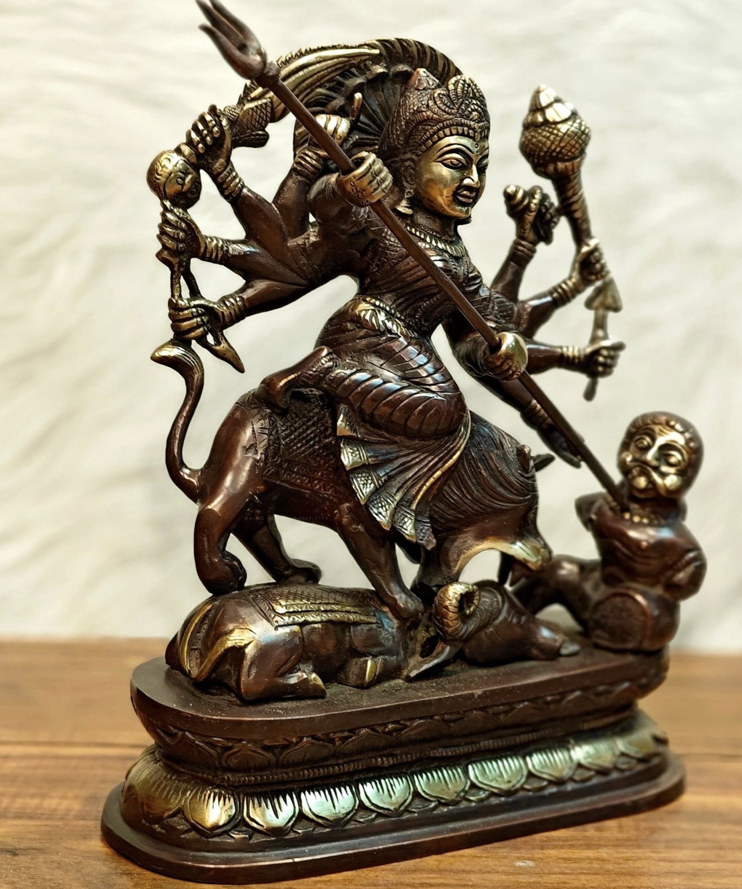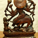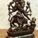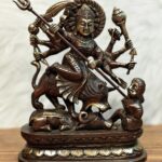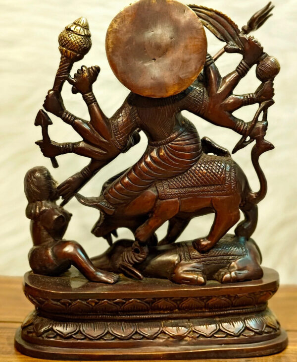 Experience the embodiment of strength with our Pure Brass Goddess Durga as Mahishasura Mardini idol. Standing at 13.5 inches, width10.5 x Depth 5 inches, this 8 kg masterpiece captures the fierce and protective energy of the divine goddess.