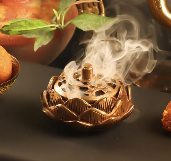 Simply place your favorite dhoop or incense cone on the burner’s designated platform, light it, and let the fragrant smoke rise, filling the air with a soothing aroma. As the incense burns, it purifies the surrounding energy and creates a sense of calm and serenity.