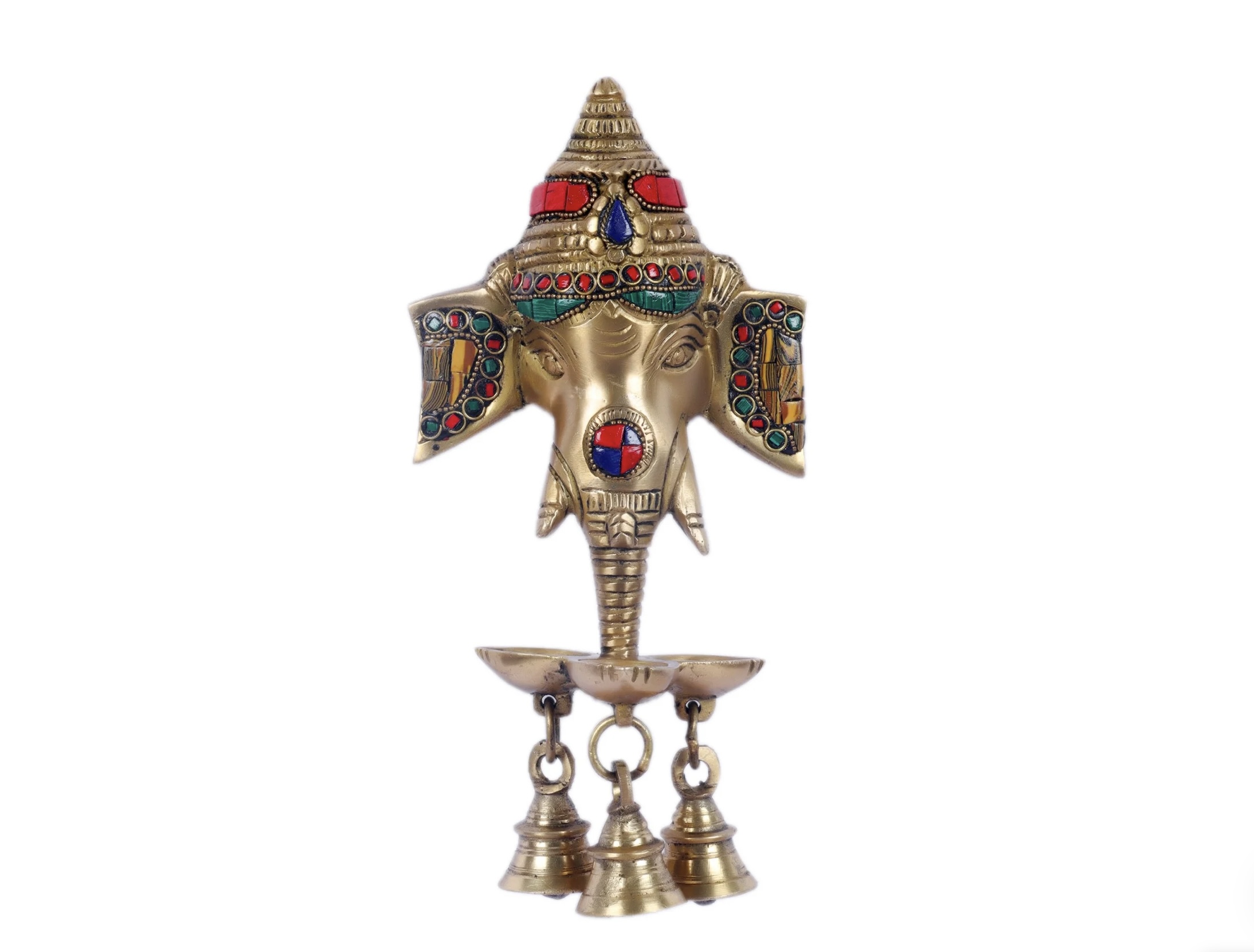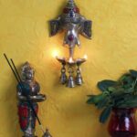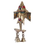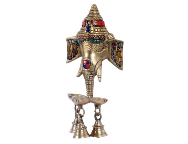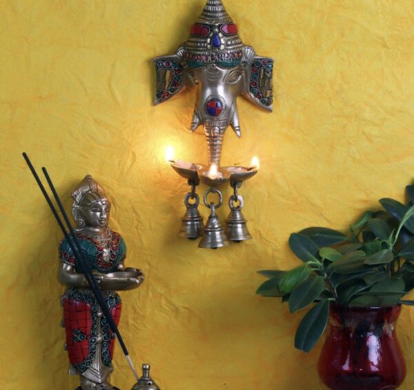 Ganesha diya wall hanging lamp. Gift this wall hanging diya to your loved ones or buy it to light up your house or workplace. This wall hanging is made up of pure brass and the colorful stones make it look even better