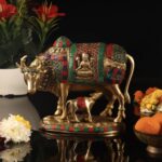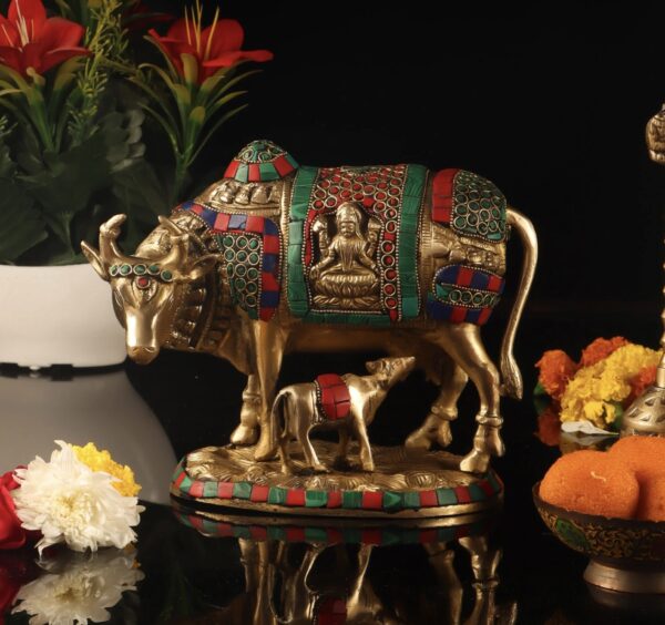 Enhance your prosperity with this intricately carved brass cow and calf statue, featuring Ganesha and Lakshmi. Measuring 7 inches in height, 8.5 inches in width, and 4.5 inches in depth, this statue is believed to bring financial gains and eliminate illness in your family.