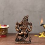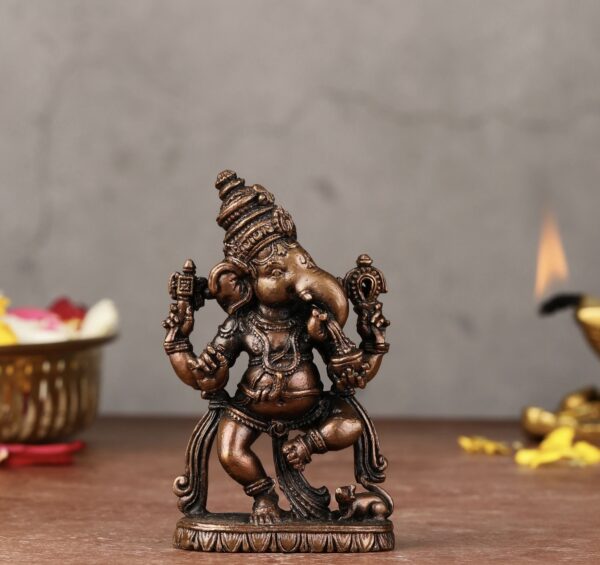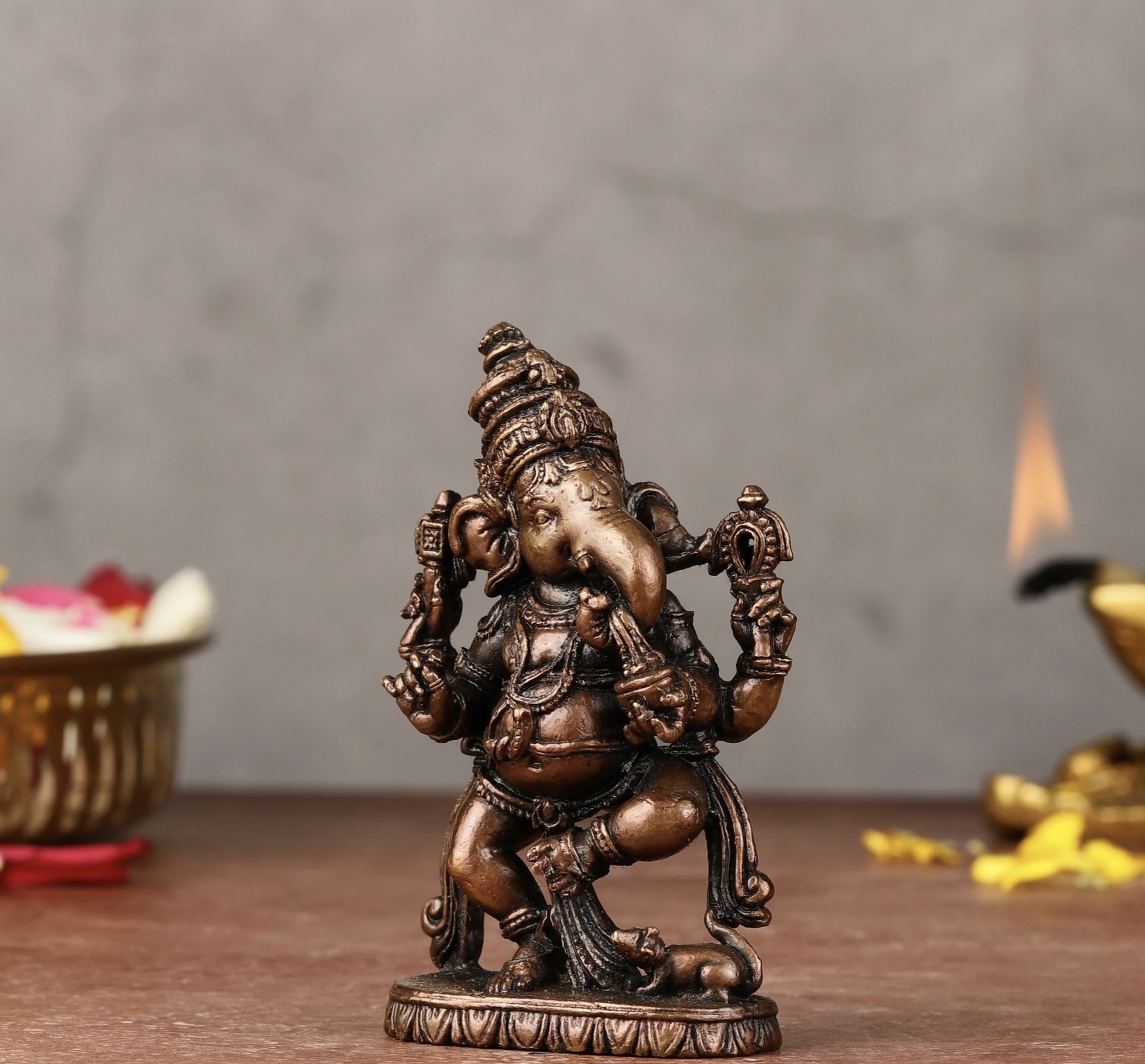 Celebrate the joyous spirit of Vinayaka with our pure copper Dancing Ganapati statue. Standing at 3 inches tall and weighing 174 gm, this intricately crafted piece captures the lively essence of Lord Ganesha’s dance, bringing joy and auspiciousness to your space.
