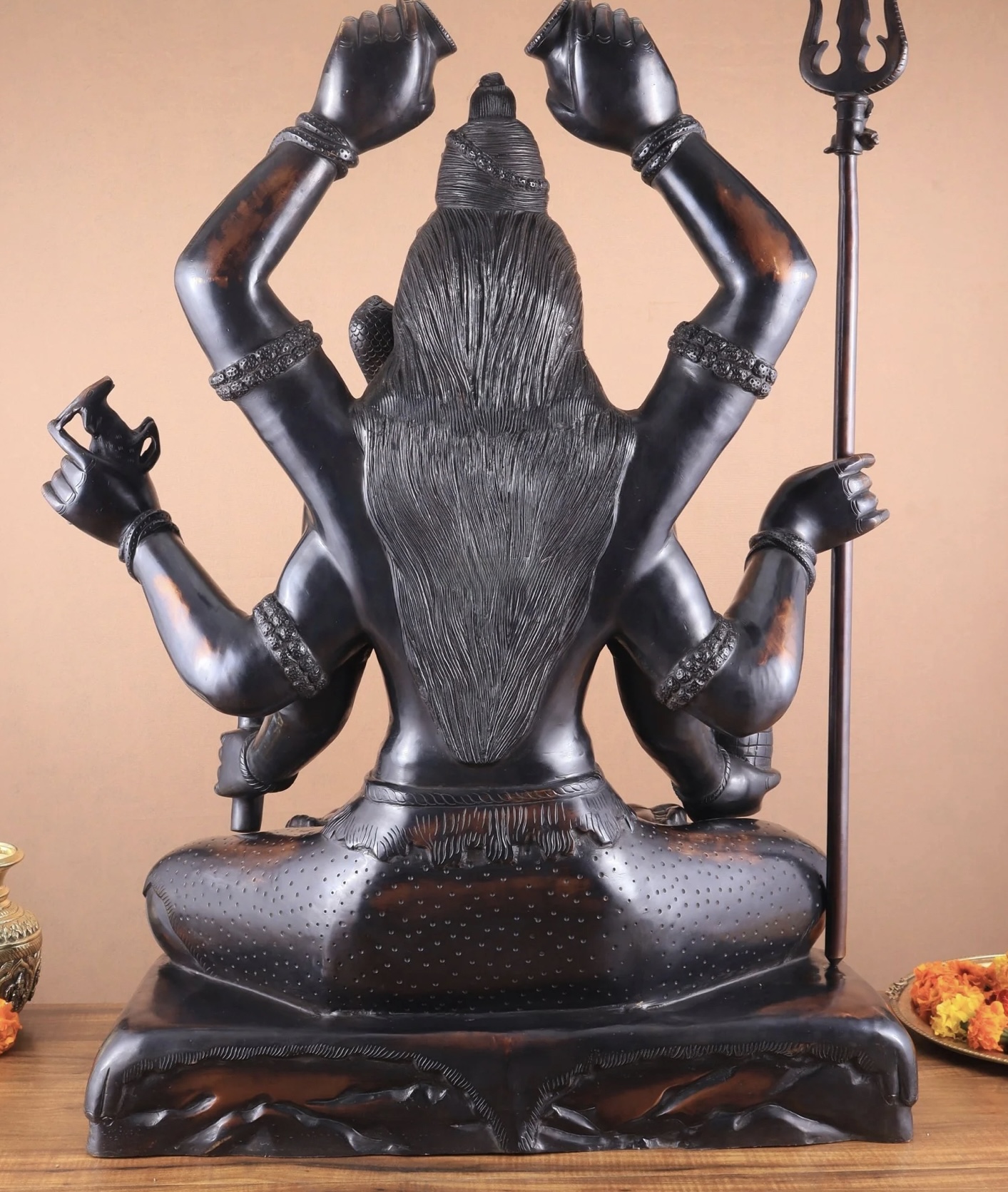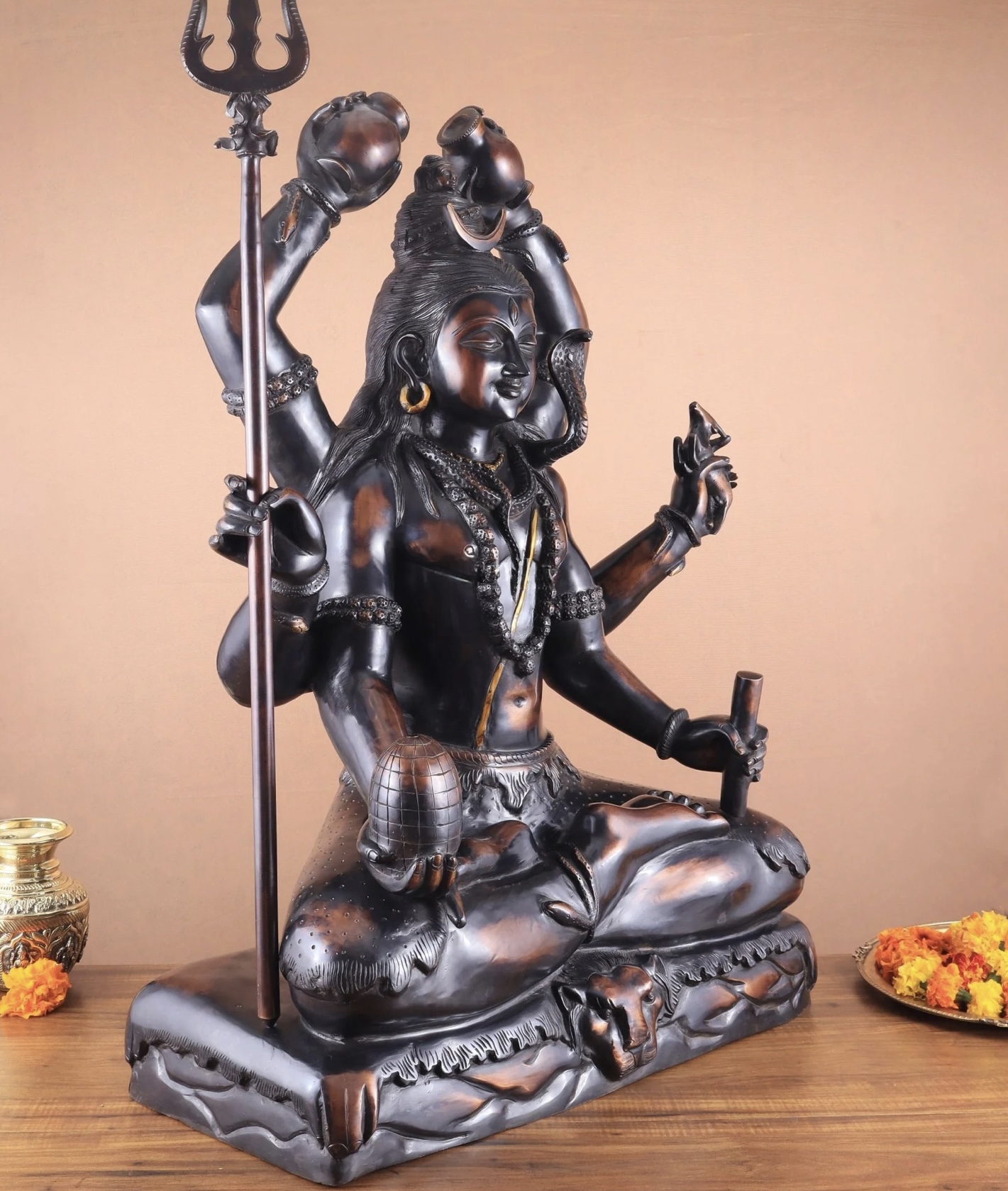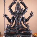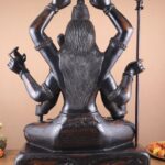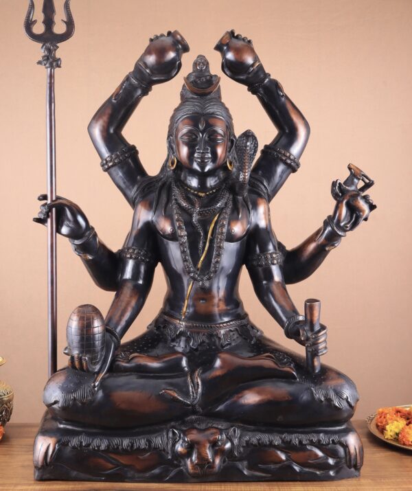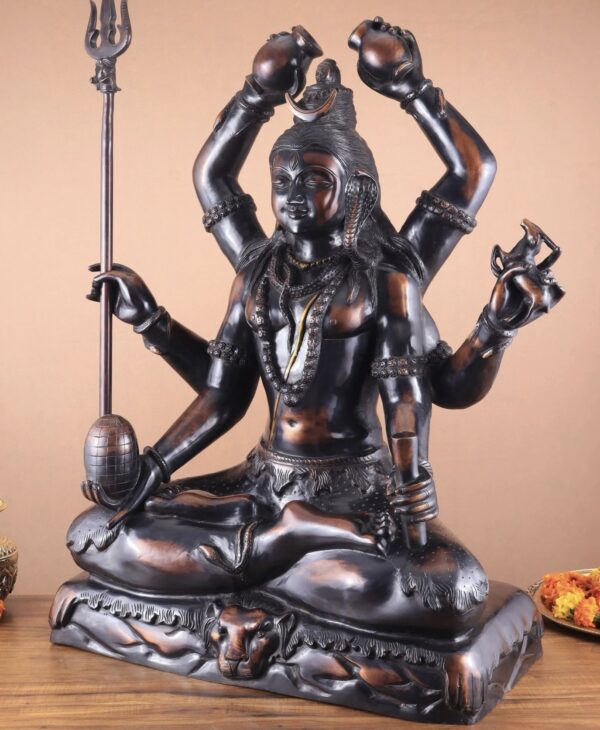 Experience the divine presence of the Six-Armed Shiva statue in vintage bronze tone, handcrafted in superfine Brass by skilled artisans. Representing Mahakala, the embodiment of Time and eternity, this exquisite statue brings strength, protection, and blessings. Height 30 inches, Width 22 inches, Depth 10 inches; Weight approximately 46 kgs.
